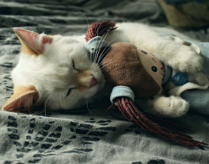 13- Aquí vemos a un pequeño gatito durmiendo plácidamente mientras abraza a su juguete favorito.