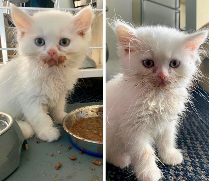11- Para continuar con las fotos de gatitos, te traemos a este cachorro que acaba de comerse todo su alimento de una forma bien particular.