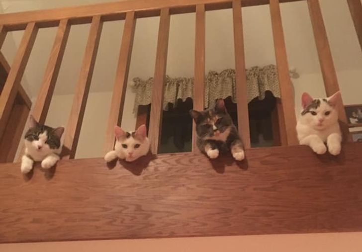 16- En este caso podemos apreciar cómo cuatro gatitos miran atentamente a sus amos desde el segundo nivel del hogar.