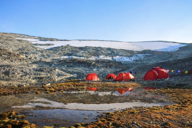 Dejando un equipo allí, Pilø se alejó del grupo junto con otro arqueólogo; ellos caminaron por el borde del hielo derretido que se vio envuelto en la niebla fría de la montaña.